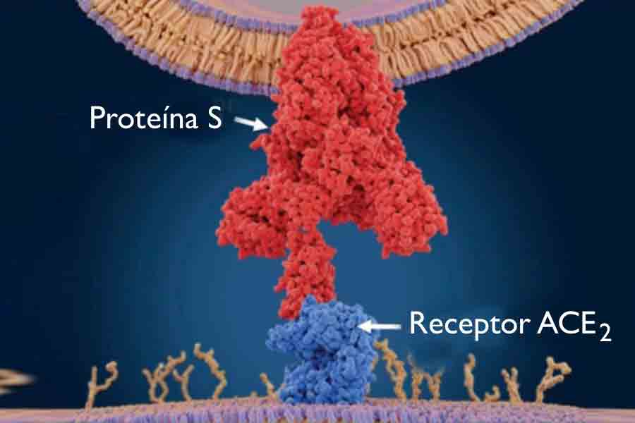 El primer paso de la infección por coronavirus es la entrada del virus en las células. El coronavirus SARS-CoV-2 entra en las células a través de la unión de una proteína de su superficie, la proteína S, con el receptor ACE-2 (enzima convertidora de angiotensina 2) de las células huésped. ACE-2 forma parte de una ruta bioquímica que interviene en la regulación de procesos como la inflamación o la presión sanguínea y su función habitual es modular la actividad de la angiotensina 2 para contrarrestar sus efectos dañinos.